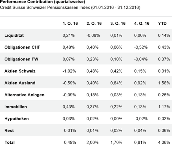 Die annualisierte Rendite des Credit Suisse Schweizer Pensionskassen Index (seit 01.01.2000) beträgt per 31. Dezember 2016 2.80%. Demgegenüber steht eine annualisierte BVG-Mindestverzinsung von 2.44%.