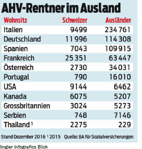 Selbst manche Parlamentarier sind sich nicht bewusst, dass schon heute 32,3 Prozent aller AHV – Renten ins Ausland bezahlt werden. Der Anteil an der Rentensumme liegt mit 13,1 Prozent deutlich tiefer. Unter den Bezügern befinden sich ausgewanderte Schweizer und Ausländer, die nach der Pensionierung in ihr Heimatland zurückkehren.
