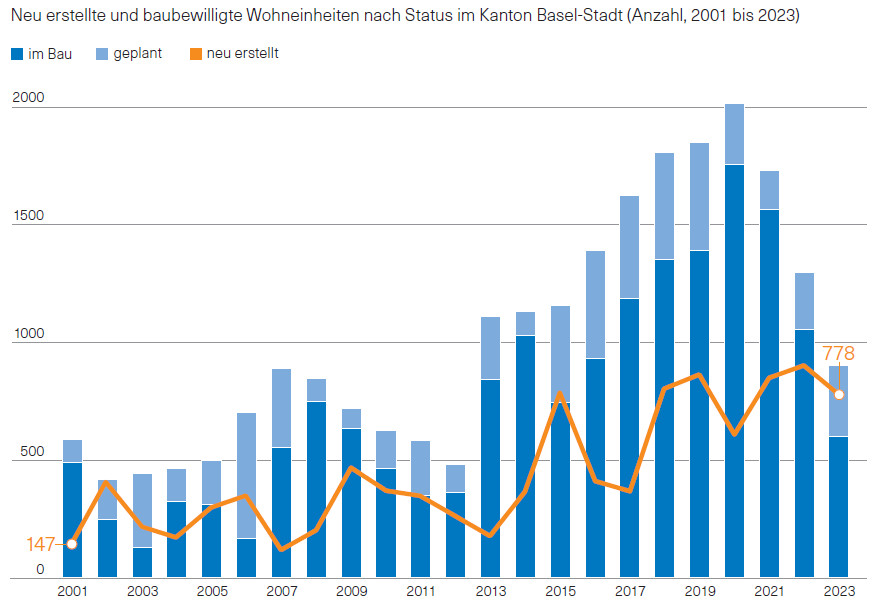 Wie die Abbildung zu den neu erstellten und bewilligten Wohneinheiten zeigt, ist die Neubautätigkeit im Kanton Basel-Stadt trotz der Zuwanderung und einem bei 1,1 % nach wie vor tiefen Leerwohnungsbestand im Jahr 2023 leicht gesunken: Sie lag mit 778 Wohneinheiten um 13,7 % tiefer als 2022. In den kommenden Jahren wird das Bauvolumen weiter sinken. Die Zahl der bewilligten, im Bau oder in Planung befindlichen Objekte hat sich seit 2020 mehr als halbiert.